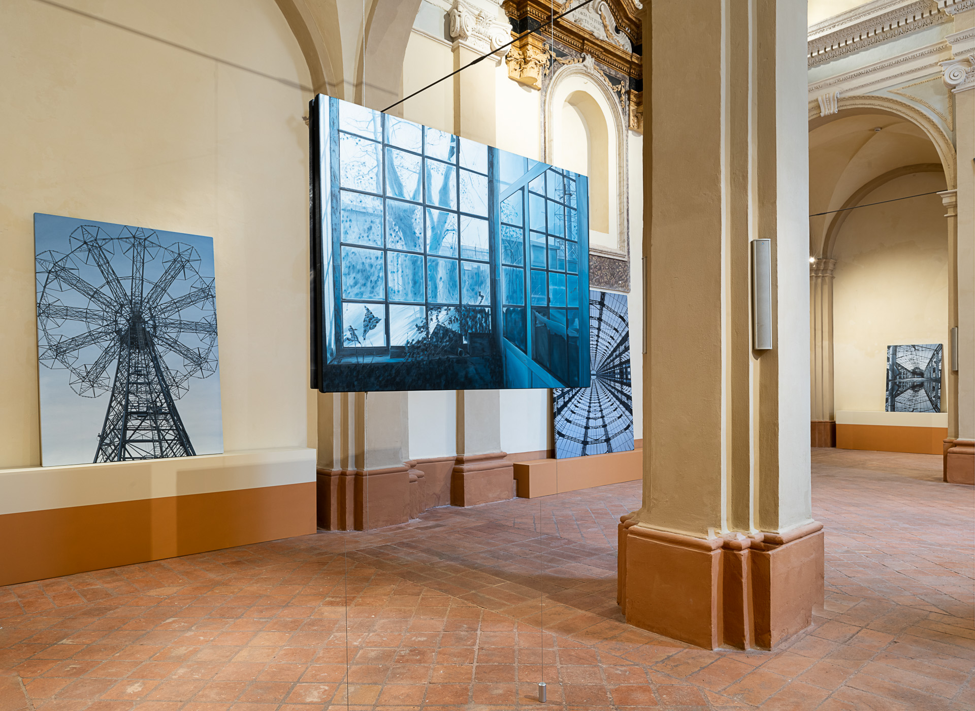 La prima sala, l’ex Chiesa, per l’occasione denominata Eschatos (“luoghi ultimi”), presenta dipinti a olio che hanno per soggetto strutture connesse all’archeologia industriale che costellano il territorio italiano. In queste tele Chiesi documenta le macerie lasciate dalla produzione industriale, rimandando al rapporto “a perdere” tra l’uomo e la macchina: l’artista descrive dei corpi-fabbrica sui quali le categorie di spazio e di tempo hanno esercitato con violenza la propria azione.