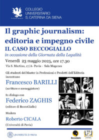 Venerdì 23 maggio alle ore 17.30 il Collegio S. Caterina da Siena di Pavia celebra la Giornata della Legalità con un incontro nel segno del graphic novel ospitando Francesco Barilli, noto scrittore e sceneggiatore di fumetti di impegno civile e autore della casa editrice Beccogiallo, in dialogo con l’editore e fondatore Federico Zaghis.L’incontro dedicato al graphic journalism, aperto al pubblico, è anche l’occasione per l’open day del master pavese, tra i più autorevoli a livello nazionale nel campo delle professioni dei libri, con la cerimonia di consegna dei diplomi degli allievi dell’anno accademico passato.