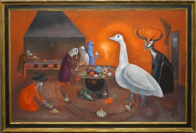A livello stilistico, l’artista unì la logica intuitiva del fantastico con una sorprendente maestria tecnica, assorbita sì dalle influenze dei pittori del Trecento e del Quattrocento italiani durante un suo soggiorno fiorentino, ma resa unica dalla sua fascinazione per la pittura fiamminga. La sua profonda affinità con l’immaginario di Hieronymus Bosch è del tutto evidente: Carrington recuperò la precisione miniaturistica, il dettaglio ossessivo e la capacità di popolare lo spazio pittorico con il campionario infinito delle creature ibride, fantastiche e grottesche del pittore fiammingo. Questa precisione pittorica, utilizzata per narrazioni oniriche e criptiche, le permise di forgiare un linguaggio maturo e personale che la distinse dai suoi contemporanei e la rese una delle figure più influenti e rivoluzionarie del XX secolo.